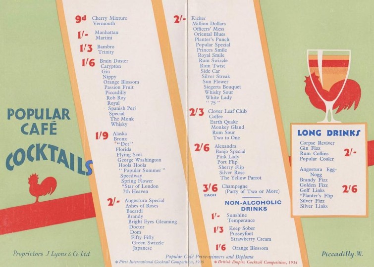 这是张鸡尾酒菜单。图上“9^d”指的是9便士,“1/3”指的是1先令3便士。1英镑=20先令,1先令=12便士。所以图上的产品价格在0.0375–0.175英镑之间。